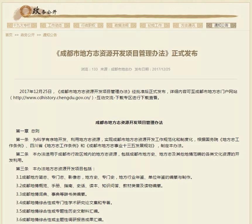 2017年12月25日,成都市地方志办公室印发《成都市地方志资源开发项目管理办法》(来源:成都市地方志网)