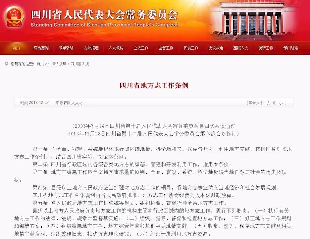 《四川省地方志工作条例》,2003年7月24日四川省第十届人民代表大会常务委员会第四次会议通过,2013年11月28日四川省第十二届人民代表大会常务委员会第六次会议修订。
