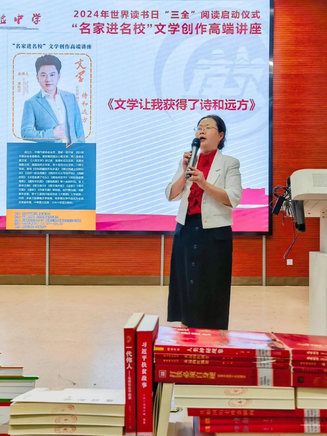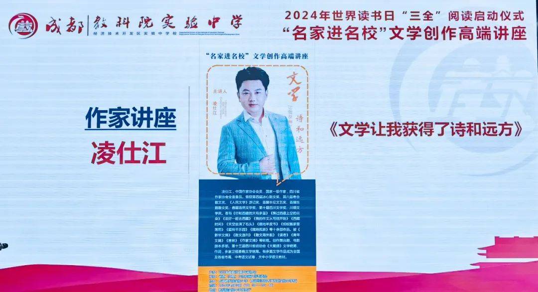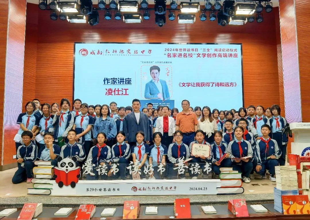 2024年4月23日晚,在第29个“世界读书日”之际,冰心散文奖、老舍散文奖、四川文学奖得主,国家一级专业作家凌仕江应邀来到成都教科院实验中学(成都经开区实验中学),融入400名中学生代表中,除分享阅读与人生的乐趣外,重点传授了自身实践多年的写作秘籍,并为同学们的写作与成长解疑答难,受到现场师生的交口称赞和热烈追捧。