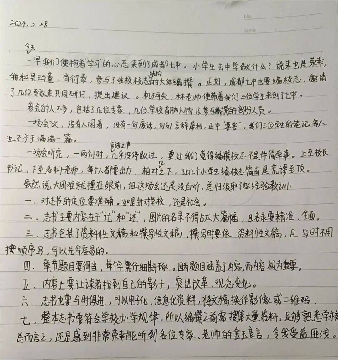 2024年2月28日,我们校志编撰小组十分幸运地到成都七中(林荫校区)旁听了七中120周年校志篇目大纲评审会。听完后我们收获满满,受益匪浅,明白了校志编纂的7个要点: