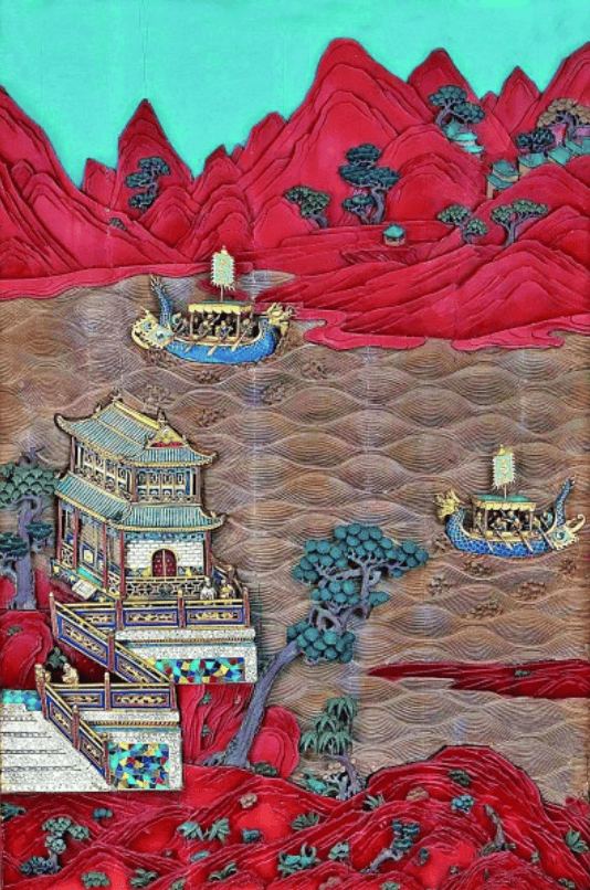 清代雕漆嵌掐丝珐琅龙舟竞渡图插屏画面