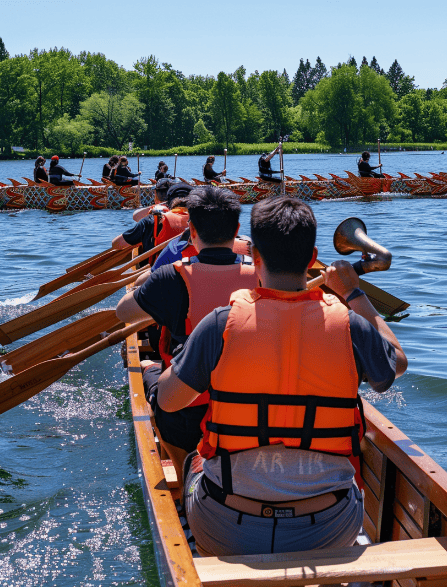 龙舟竞渡,相沿至今,虽各地规模大小不一,但形式内容大同小异。顺庆最早记载端午节划龙舟是明正德年间,顺庆知府皇甫录《下陴纪谈》:“顺庆以端午日赛社,作蛟舟,为水戯,舟制甚狭,仅可接膝,长短以人之多寡为差。皆相对持桡。船首击钲鼓。尾扬旗各一人。呼噪鼓勇。以趋先为胜。予诗有‘踏浪蛟船惊电掣,殷江鼍鼓忽雷同’之句,谬为士林所赏。”顺庆制造龙舟,从开工到成舟下水,有一整套民俗仪式。造舟前,要设祭台点香、烧纸、放鞭炮祭拜龙王,以借神威,求其保佑龙舟制造顺利完成。一支龙舟在经过选料、加工、铺底板、敲凉子、圆舫子、上龙头龙尾、竹麻扦船收缝、抹灰、上桐油等工序制造成后。龙舟还要彩绘装饰一番,船头要装上雕镂精美的龙头,船尾配置生动鲜活的龙尾,船体的外围要涂上本队特有色彩,队员的服装,乃至划舟的桡桨、锣鼓都要画上五颜六色的图案,加上帅旗、尾旗、三角旗、挂彩等装饰,龙舟本身就成了一件艺术品。正式比赛前,祭拜龙头的仪式更加庄重而热烈。一大早,船员们便来到江边,在自己的龙舟前设置祭台,鸣响鞭炮,燃香献供,祭拜“龙王”。船员们跪在江边的鹅卵石滩上,毕恭毕敬地手持三炷香,对着龙头虔诚三拜,然后将壮行酒一饮而尽,随后一一登船,在鞭炮的爆鸣和硝烟中将龙舟划向比赛集中地点。