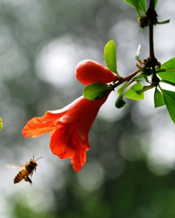 古典诗词中,文人多用玛瑙、琥珀、赤玉等来比喻石榴花的“红”,估计是觉得仍然难尽其美,于是,他们又以“火”喻榴花。此诗抓住榴花最引人注目的颜色,写尽了榴花的如火似霞、耀眼夺目。佳人采来榴花插在玉钗上,诗人却担心这如焰的赤红会把姑娘的鬓发烧了。这一新奇精巧的比喻可谓神来之笔,把“火”渲染得迫在眉睫!元代诗人张弘范《咏石榴》写道:“游蜂错认枝头火,忙驾熏风过短墙”,蜜蜂误将枝头的榴花认作火焰,匆匆乘风逃走,运用夸张手法,把花的红艳、蜂的惊惧写得活灵活现,令人莞尔。