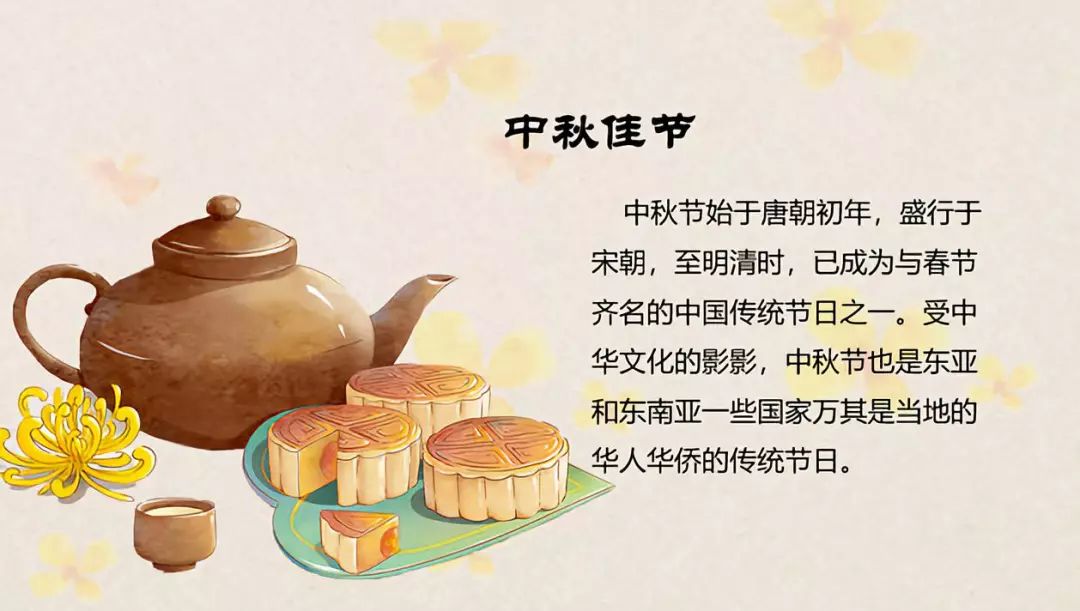 受中华文化影响,中秋节也是东亚和东南亚一些国家尤其是当地华人华侨的传统节日。中秋节以月之圆兆人之团圆,寄托思念故乡、思念亲人之情,祈盼丰收、幸福,成为丰富多彩、弥足珍贵的文化遗产。中秋节与端午节、春节、清明节,并称为中国四大传统节日。