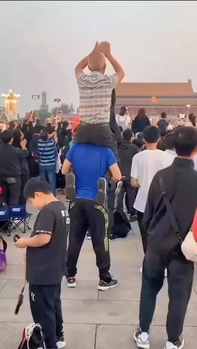 眼看离升旗仪式开始只有几分钟时间,再犹豫下去,几个小时就白等了。于雷没等说服父亲,直接半蹲下来,把父亲往肩头上架,旁边一位男子见状,也来帮忙,将于雷父亲扶上他的肩头。“父亲不重,大概只有120 斤,我能架动。”相较于1.8 米高、160 斤重的于雷,父亲显得很瘦弱。架着父亲,于雷双手一直稳稳地扶着父亲双腿。