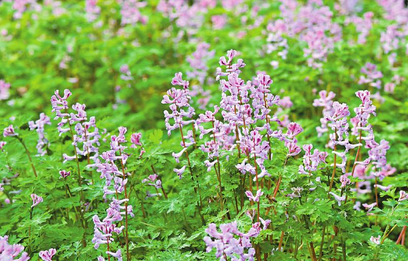 紫堇永远出现在成都的春光之中,每当春天来临的时候,紫堇就会纷纷争抢着开出粉紫色娇俏可爱的小花。只不过,一小株紫堇,就算开花,因为总是躲藏在草坪之中,身材也不高大,很难引起我们的注意。只有当一大片紫堇花猛地出现在你眼前时,你才会眼前一亮,你会发现,它们开着粉紫色的小花,此起彼伏,你争我赶,就像一群小鸟,争先恐后地从草坪中飞了出来,就像在向你欢呼:春天来了!春天来了!