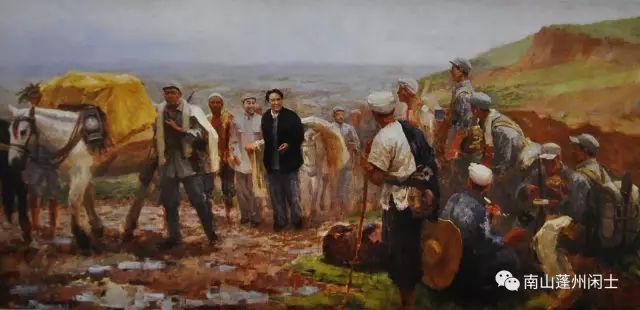 创作背景:抗战胜利后,蒋介石一意孤行,悍然发动全面内战。1947年3月,国民党军以25万人的兵力向陕北解放区发动重点进攻,企图达到攻占延安、摧毁共产党的党、政、军指挥中心,动摇军心,瓦解意志,削弱国际地位的目的。当时,在陕北的人民解放军仅1.6万余人,双方兵力极为悬殊。但毛泽东高瞻远瞩,决定亲自率领中共中央和人民解放军总部机关主动撤离延安,在极其艰险的环境中转战陕北达371天,行程1000余公里,并继续指挥全国解放战争,从而极大地鼓舞了全国各解放区军民的战斗意志和胜利信心。油画《转战陕北》,反映了毛泽东在极端艰苦和十分险恶的环境下依然乐观自信,对革命胜利充满信心。