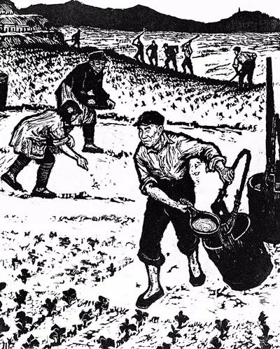 版画《亲自动手生产——朱总司令的故事之四》(张漾兮创作,图片来源:中国美术馆网)