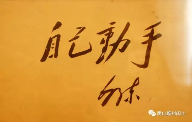 “自己动手”“丰衣足食”八个大字,是毛泽东主席的著名题词墨迹。1943年,八路军总政治部电影团拍摄电影纪录片《生产、战斗结合起来》,后改名《南泥湾》。在电影即将拍完时,时任摄影队长的吴印咸到延安中共中央所在地枣园请毛泽东主席为电影题词。毛泽东欣然同意,因窑洞内太暗,就到窑洞外写。毛泽东在两张白色的凸版纸上分别题写了“自己动手”“丰衣足食”八个大字,并签上自己的名字。