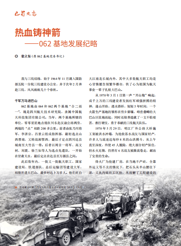 062基地由064和062两个基地“合二而一”,现是四川航天技术研究院,隶属中国航天科技集团有限公司。当年,两个基地所辖的单位,零零星星地点缀在川东北汉渝公路两旁,两端的“点”相距200多公里。前者由张乃川将军、李济宗、吕景云组成指挥部,最初选点山西晋南,又转战湘鄂西,最后才定点四川达县城南至大竹县一带。后者以周吉一将军、高文树、刘震、徐兰如等人为选点先遣队,一开始在甘肃天水,最后定点在达县至万源县之间。