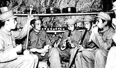 王莘在朝鲜战场和慰问团排练《歌唱祖国》