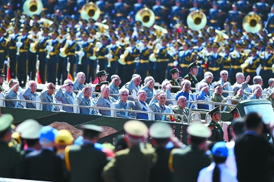 2015年9月3日,中国人民抗日战争暨世界反法西斯战争胜利70周年纪念大会在北京隆重举行。这是抗战老兵乘车方队通过天安门广场。新华社记者 王定昶摄