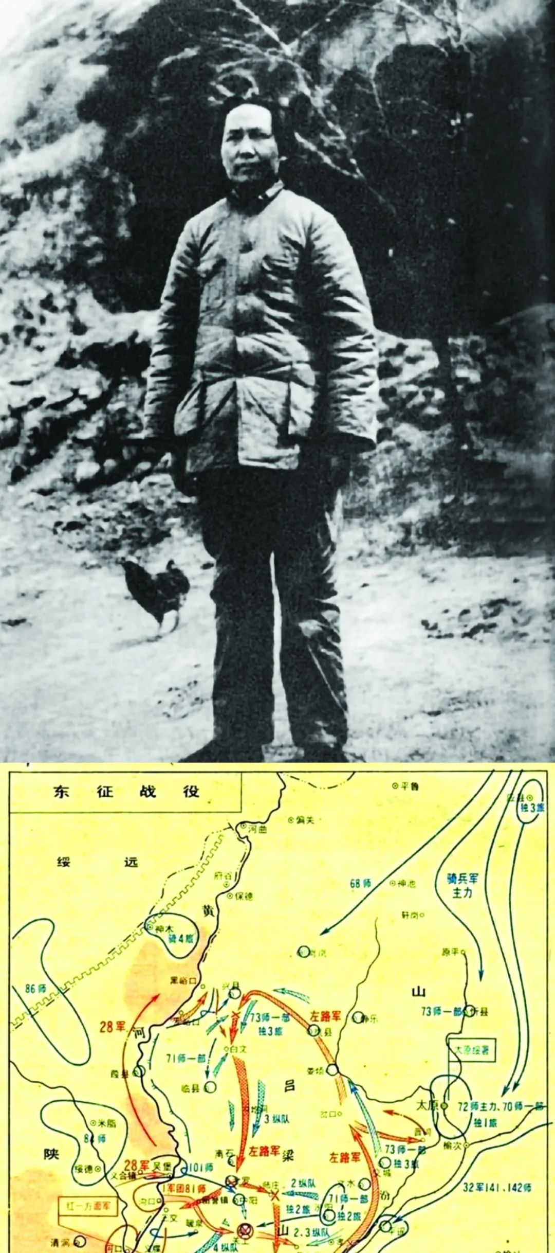 1935年12月,中共中央在瓦窑堡召开政治局扩大会议,作出渡河东征的战略决策。1936年2月下旬,毛泽东、彭德怀率中国人民红军抗日先锋军东渡黄河入吕梁,开始东征,红军边战斗边发动群众。历时75天的东征战役,对解决陕甘根据地的经济困难和增强红军实力发挥了重要作用。上图为1936年的毛泽东,下图为红军东征战略简图