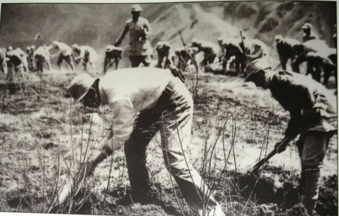 在抗日战争最艰苦的时期,日军对晋绥边区进行疯狂“扫荡”、蚕食和经济封锁。吕梁军民在贺龙等同志的领导下开展大生产运动,在晋绥所属机关中发起自力更生、勤俭节约运动,用艰苦奋斗开创了丰衣足食的局面。图为大生产运动场景