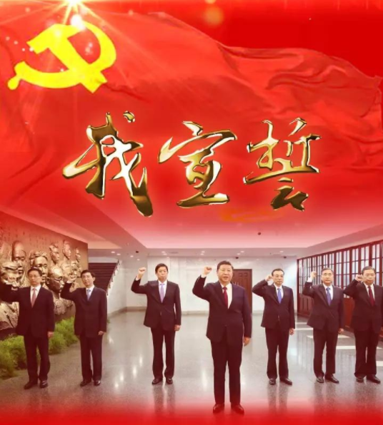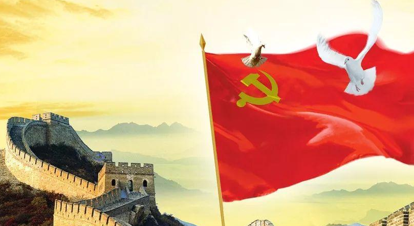 党旗飘飘,舒展着世上最美的图案;迎风高扬,展现出一幅壮丽的画卷。巨斧神工,劈开黎明前漫长的黑暗;银镰闪光,斩断旧世界沉重的锁链。饮尽百年屈辱,饱受凄风苦雨,亿万同志的铮铮誓言,众志成城,气壮河山;踏破铁马冰河,冒着炮火硝烟,无数先烈血染的风采,铸就了举世无双的光辉灿烂。