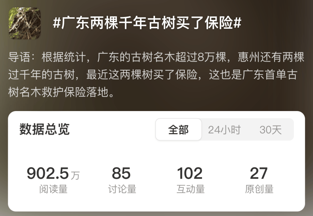“古树买保险”这样新颖的话题,还自带“吸睛”属性,能让更多公众看见古树、了解古树,激发参与保护古树行动的意愿。“广东两棵千年古树买了保险”的词条曾登上微博热搜,阅读量超900万,吸引了许多网友在评论区分享对古树保护的观点。