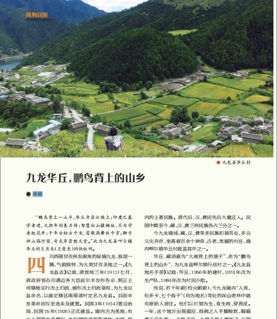 “鹏鸟背上一山乡,华丘寺在云端上;印度巴基学者建,元朝年间美名传;智慧仙山撮姆址,尽为学者把花开;千年古柏云中坐,莺歌燕舞林中穿;狮子神山隔河望,奇光异景胜天堂。”此为九龙县呷尔镇华丘村王长生(王老表)的快板词。四川西部甘孜州东南角的秘境九龙,独居一隅,气韵独特,为大美甘孜圣地之一。《九龙县志》记载,清宣统三年(1911)七月,清政府督办川滇边务大臣赵尔丰发布告示,明正土司辖地实行改土归流,颁布改土归流章程,为九龙设县命名,以康定辖区南部诸村定名九龙县。后因辛亥革命政权更迭未及建置。民国3年(1914)置设治局,民国 15年(1926)正式建县。境内古为羌地,有大小部落生息繁衍,由狩猎演进而事游牧、农耕,居 处境内。为史籍泛称“西南夷”的一部分。藏族为境内的土著民族。清代后,汉、彝民先后大量迁入。民国中期至今,藏、汉、彝三种民族各占三分之一。
