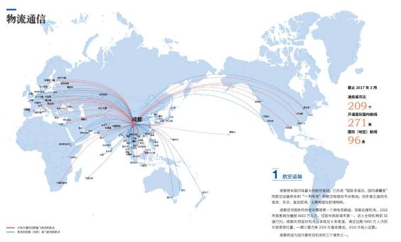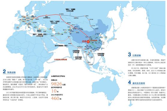 改革开放以来,成都综合交通枢纽基本骨架初步形成。天府国际机场主体工程及配套设施加快建设,双流国际机场扩能改造顺利推进。2017年实施14条国铁公交化改造,编制完成《成都市域高快速路网体系规划》《成都市慢行交通系统规划》,成安渝高速、三绕高速南段建成通车,天府国际机场开工建设。成渝、西成、成绵乐客专开通运营;西部高速公路主枢纽初步建成;《成都铁路枢纽规划(2016-2030年)》获批,西成客专、成昆铁路成都至峨眉段扩能改造建成投用,火车北站扩能改造、成蒲铁路等项目加快推进,成德动车加密开行。