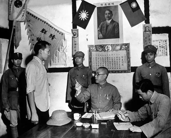 1941年,简阳县龙泉驿,当地政府官员在审理一男子偷窃案件(卡尔·迈登斯/摄)