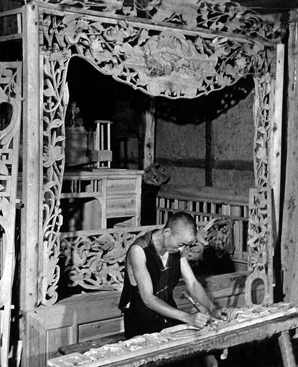 1941年,简阳县龙泉驿,木匠师傅在雕刻新婚夫妇用的婚床(卡尔·迈登斯/摄)