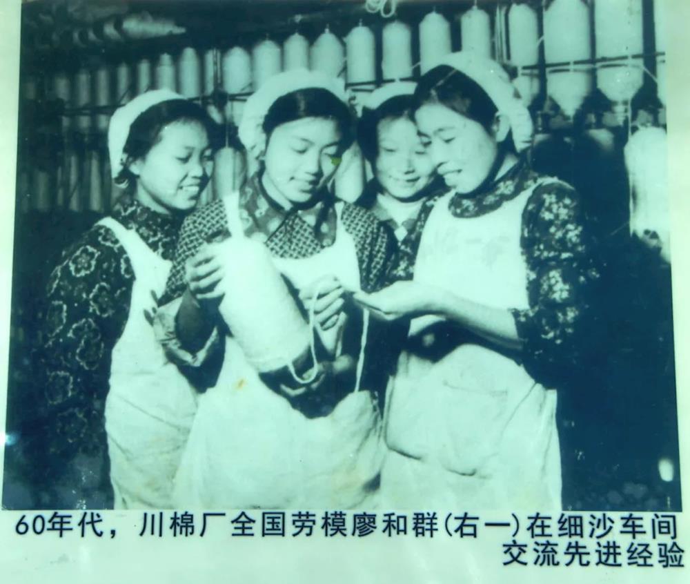 1960年代,川棉厂全国劳模廖和群(右一)在西纱车间交流先进经验(蓬州闲士翻拍于成都东郊记忆)