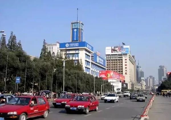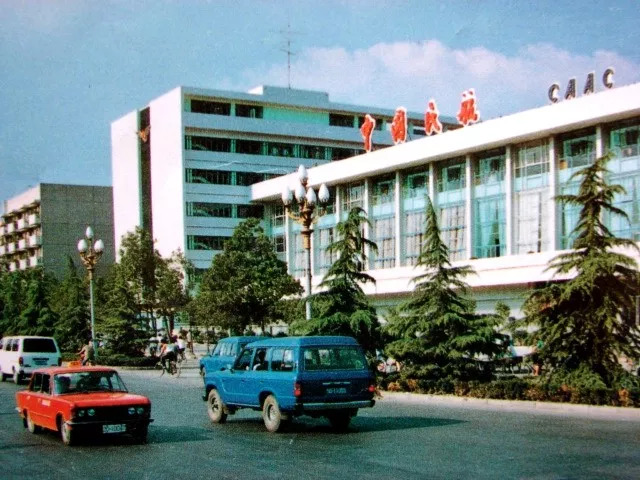 1987年,人民南路民航售票处。当年乘坐飞机大都在此购买飞机票。机场大巴的出发点就在这里,那红色的是当年的出租车。