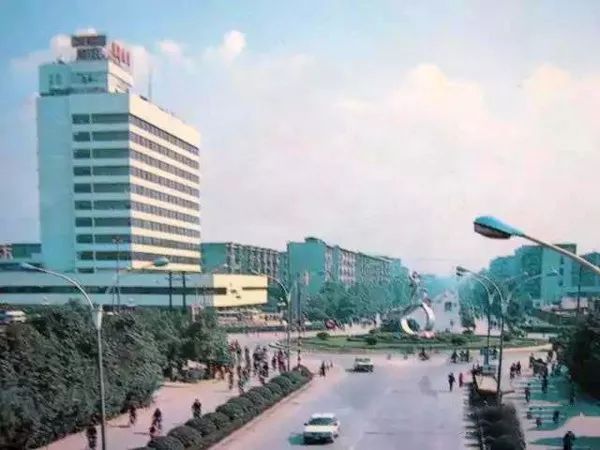 1980年代,成都饭店与“建设者”雕塑。