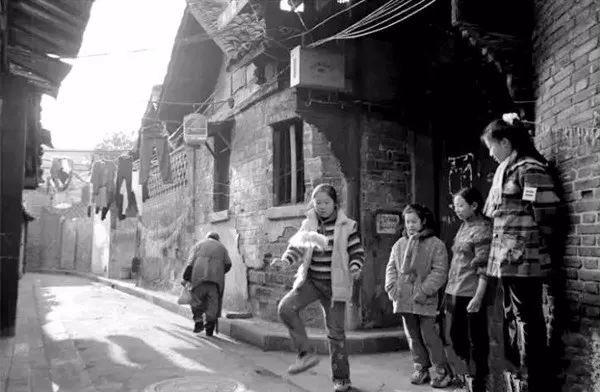 1960年代,成都三道街一民居门口,孩子们在踢毽子。