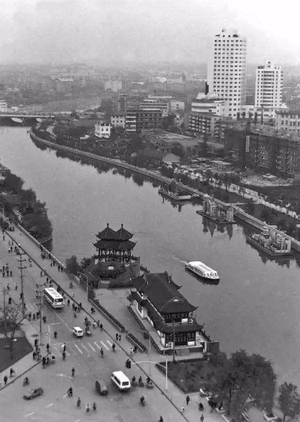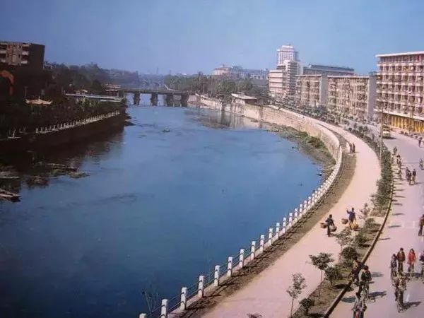 1995年,成都,刚整修后的城边街人行桥一带(现锦里中路)。上世纪70年代前,这里一直是渡口,过河都是坐木船,后来修了钢绳吊桥,80年代修成了水泥桥。
