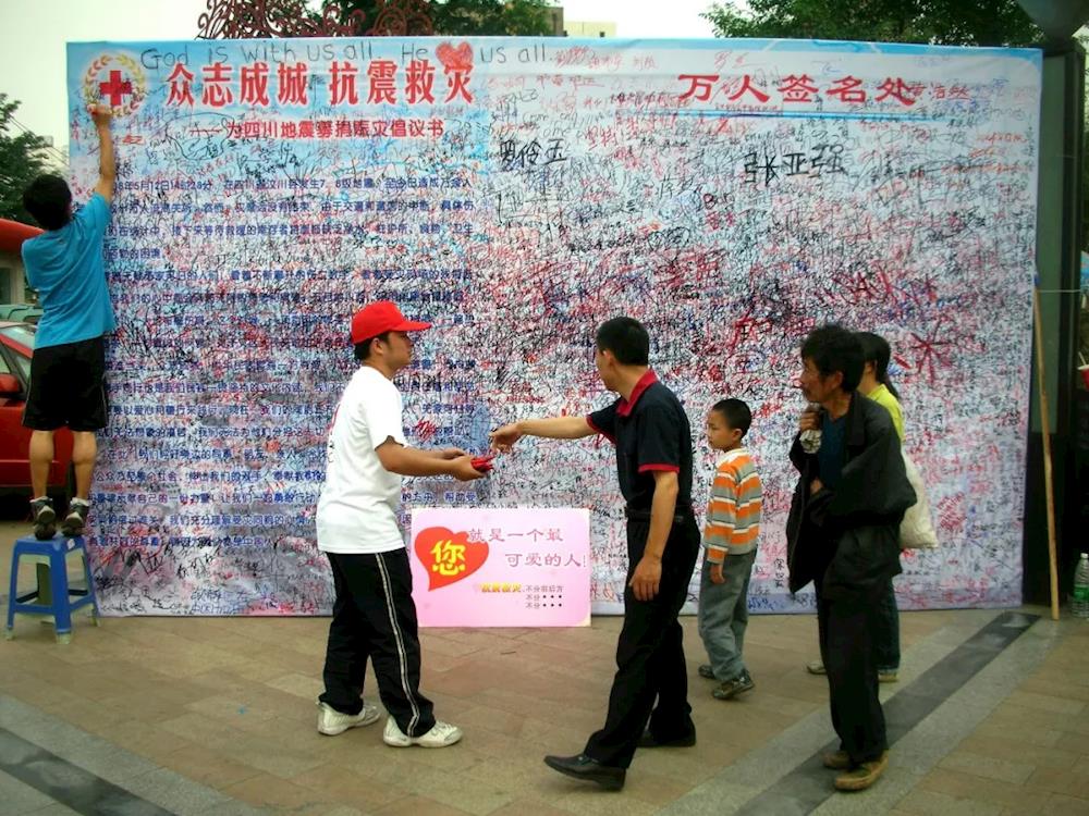 2008年5月16日,成都红星路步行街,成都市锦江区红十字会抗震救灾募捐及万人签名活动(蓬州闲士/摄)