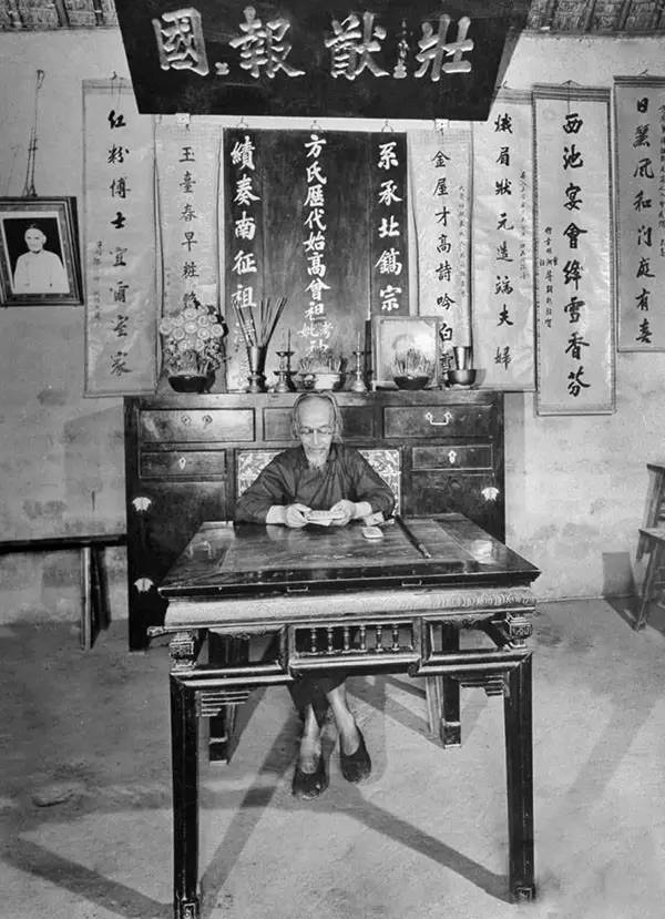 1941年,简阳县龙泉驿,一位老人在堂屋看书(卡尔·迈登斯/摄)