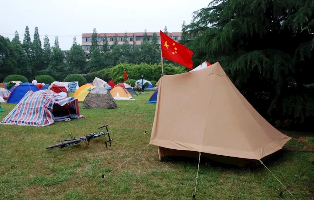 2008年5月21日,西南财经大学光华校区阳光广场插着国旗的地震帐篷(蓬州闲士/摄)