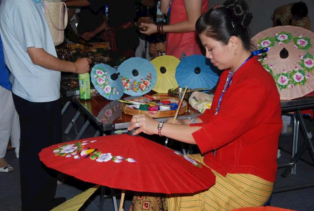 2009年6月6日,成都金牛区两河城市森林公园,中国非物质文化遗产主题公园内泰国伞画(蓬州闲士/摄)