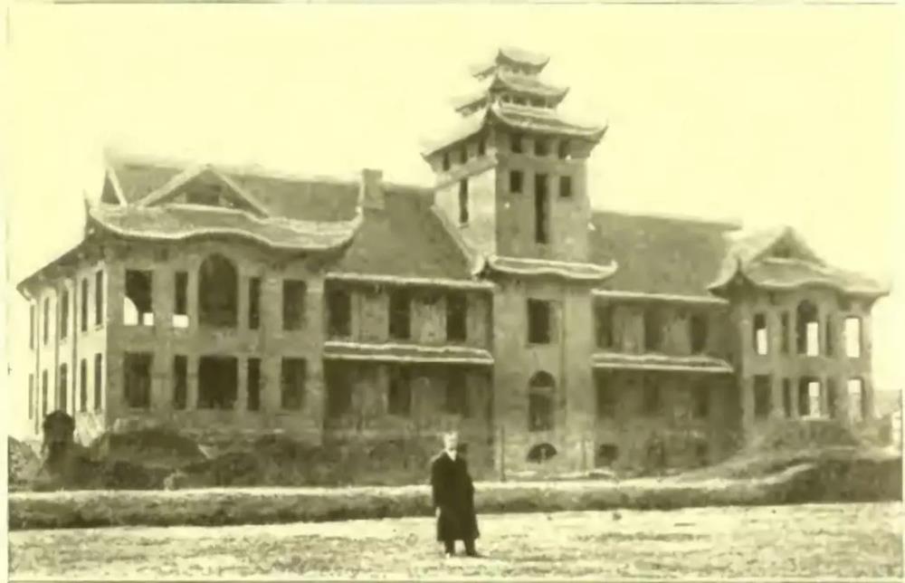 在建中的华西协和大学之赫斐院(1910年代,图片来源:曹梦芹《从成都的一处“唐破风”建筑说起》,澎湃新闻)