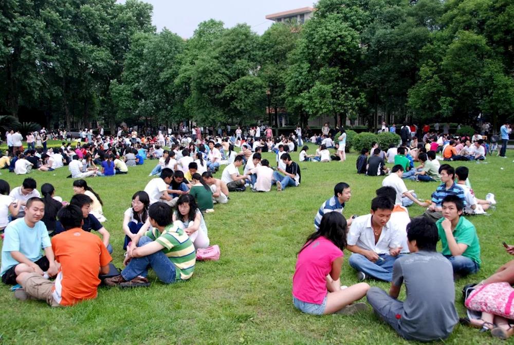 2008年5月12日16:56,成都,西南财经大学光华校区在阳光广场躲避地震的师生(蓬州闲士/摄)