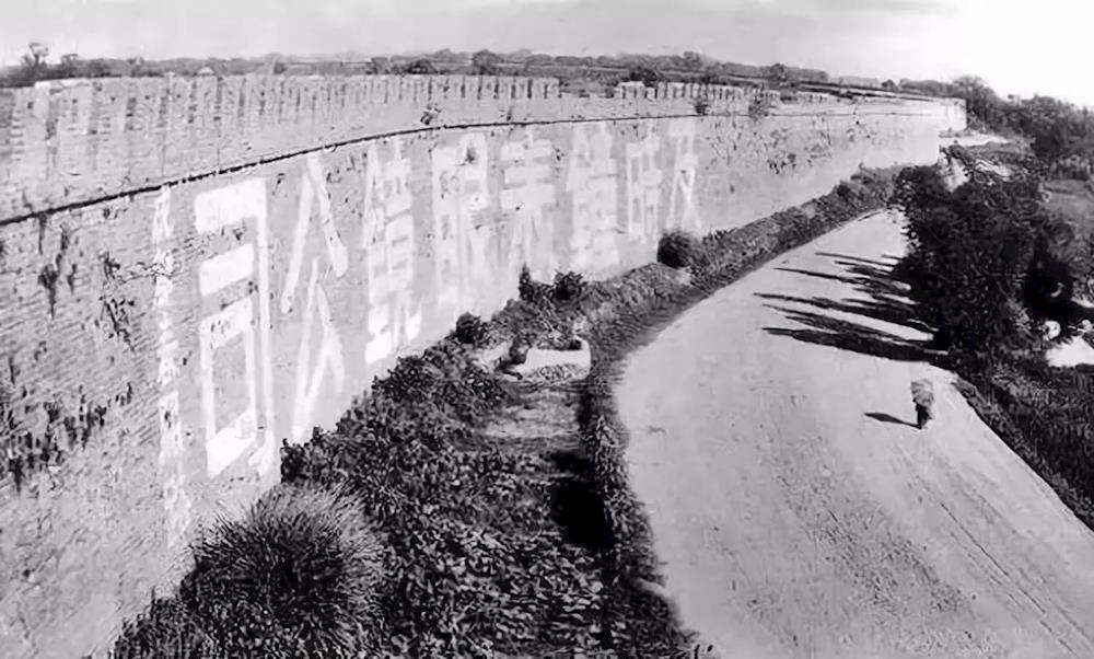 成都,西城门外的一条小路,城墙上是春熙路一家钟表行的广告(1917年左右摄)