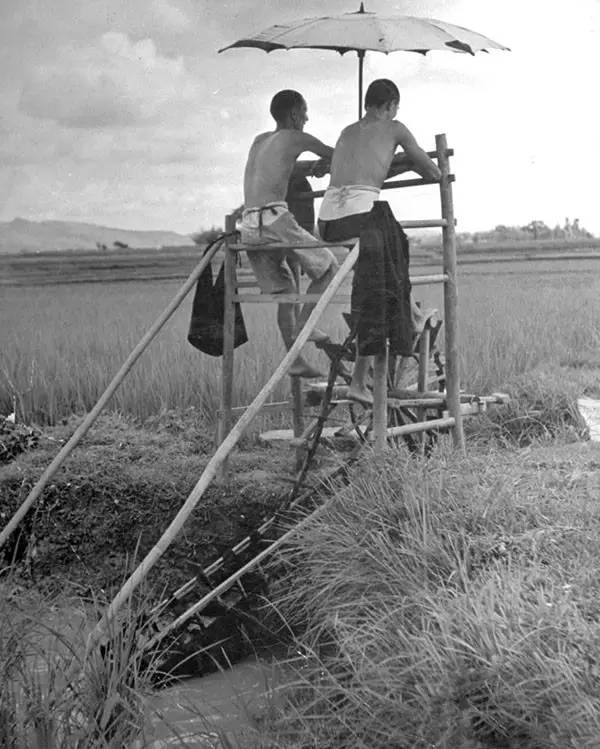 1941年,简阳县龙泉驿,脚踏水车抽水的两名男子(卡尔·迈登斯/摄)