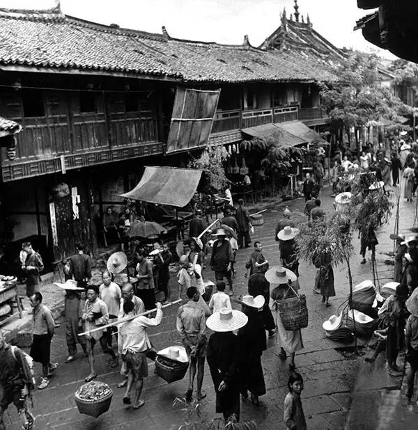 1941年,简阳县龙泉驿,镇里街道上川流不息的人群(卡尔·迈登斯/摄)
