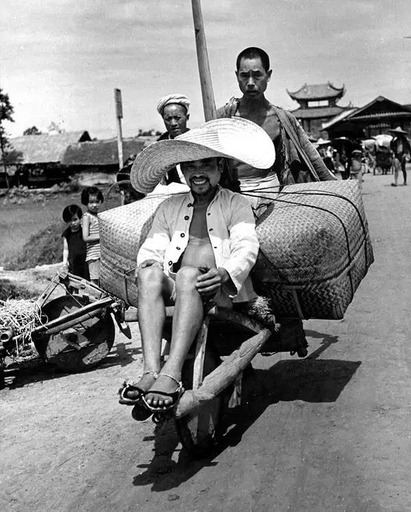 1941年,简阳县龙泉驿,一位独轮车夫揽到一笔生意,载客送货(卡尔·迈登斯/摄)