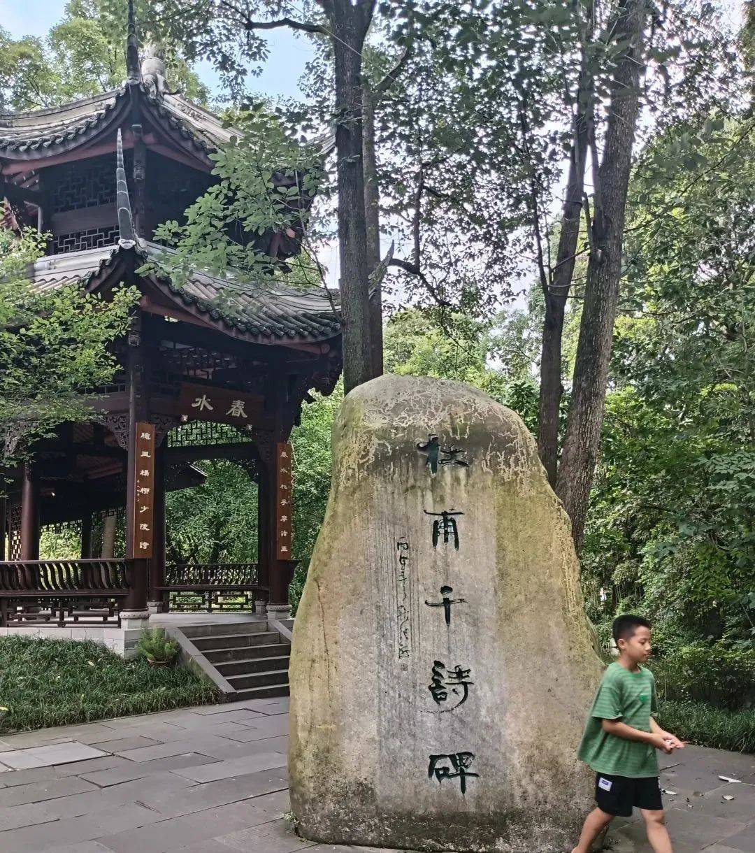 沿着“源泉”拾级而上,便是诗歌大道。诗歌大道纵贯浣花溪公园南北门,它长200米,宽3米,记录了从近代开始,直至春秋时代100多首广为流传的诗歌。随着游人步伐前行,一首首经典诗歌扑面而来。“诗可以兴,可以观,可以群,可以怨。”诗是文学巅峰,诗是鼓声号角,诗是豪情干云,诗是岩浆崩裂,诗是激情流淌。慢慢走啊,细细品尝,才能体味诗中真谛……