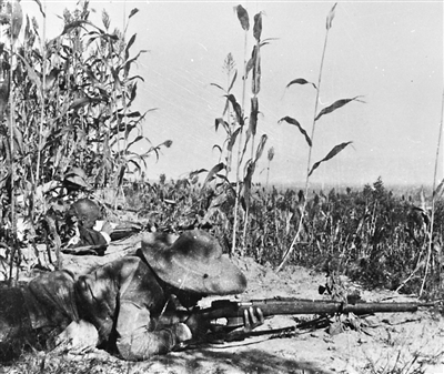 游击队员隐蔽在青纱帐中伺机杀敌。图为中国人民抗日战争纪念馆提供