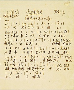 青年反复朗诵歌词,在心里记下朗诵时声调的高低、抑扬、强弱和节奏的变化,并在脑海中迅速将这些灵光乍现的乐思和旋律汇集起来,终于形成了完整的乐段。仅一天时间,这首“献给廿九军大刀队”的《大刀进行曲》便从他心底喷涌而出。这位青年,就是在党领导下的“国防音乐”运动中成长起来的青年作曲家麦新。