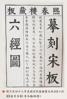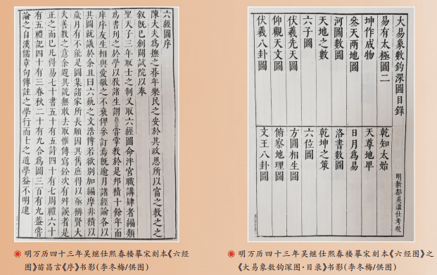 《六经图》的另一个版本体系是陈森、毛邦翰补编的抚州刻本。据苗昌言《六经图序》所载,宋孝宗乾道元年(1165),时任抚州知州的陈森“取《六经图》,命泮宫职讲肄者,编类为书,刊之于学,以教诸生”,州学教授毛邦翰等补编、监丞苗昌言校订并序之,共6卷,“凡得《易》七十,《书》五十有五,《诗》四十有七,《周礼》六十有五,《礼记》四十有三,《春秋》二十有九,合为图三百有九”。度正《性善堂稿》卷13《涪州教授陈孠由墓志铭》也有记载:“乾道间,昌元士人杨甲为《六经图》,颇便观览,好事者版行之遍天下。孠由曰:‘此乡先生之作,四方宜于此取正,而吾学无其书,可乎?’遂搜访善本,重加校正,仍命工笔札善图画者写之,刻之石,以示学者。”此本一改前人附图于书的形式,成为以图为主、以文为辅的解说六经的专门性著作。至明,新安吴继仕购得此宋本,“如获和璧”,不忍私藏,于是“一照宋板,校刻无讹”,以公诸海内。此即明万历四十三年(1615)吴继仕熙春楼刻本,凡6卷,1函6册,每半叶12行,每行23字,白口,四周单边,摹刻极真,版画精美,是现存最早的《六经图》刻本,已入选第三批《国家珍贵古籍名录》。又有明万历四十三年(1615)南京吏部刊本(又称金陵摹刻本),是本与熙春楼本同宗同源,且皆为摹刻,极似陈、毛抚州刻本。自此以后,世传刊本多由此二本出。