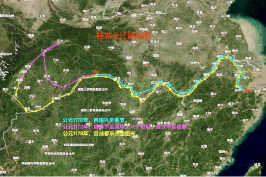 查阅陆游年谱,得知陆游46—54岁时在蜀8年(1170—1178年)的大致行踪。陆游46岁时于宋孝宗乾道六年(1170年),离开家乡山阴,溯江入蜀,始任夔州通判。宋孝宗乾道八年(1172年)二月,陆游48岁时离开夔州,经梁山、潾山、邻水、广安、岳池、南充、阆中、益昌(利州)、大安,到达宣抚使司治所兴元(今陕西汉中)权四川宣抚使司干办公事兼检法官职。