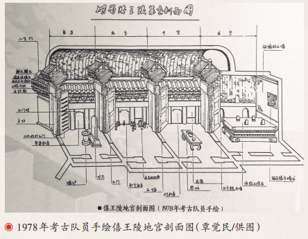 右侧不规则者实为盗洞,洞中还填有石块。考古发现,地宫中有2具男性骸骨,一具散落在寝殿中被劈开的棺木周围,是为僖王;而另一具则出现在盗洞下方。故事情节便已了然:月黑风高的深夜,几名盗墓贼攀上王陵封土,自上而下精准找到两券衔接处、地宫最薄弱的部位,凿穿券顶,踏坏殿脊,吊下绳索进入地宫,粗暴地劈开棺木拖出遗骸,大肆搜索金银细软。“摸金”得手后,不料先上去的盗墓贼起了歹心,将还未及返回地面的最后一名同伙杀死或砸晕,并以石块封堵盗洞以绝后患。