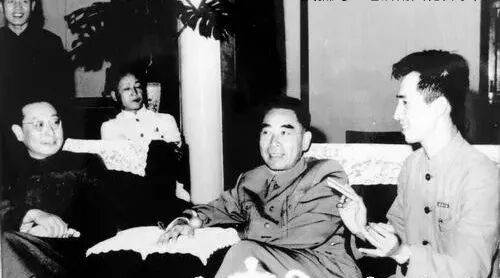齐燕铭(左)陪同周恩来听取汇报