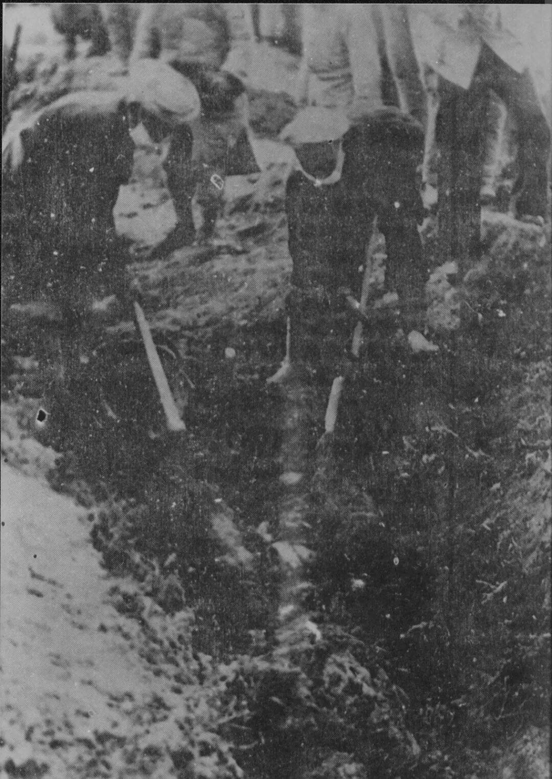 罪恶的大屠杀开始了。特务们把人带到防空壕后,最开始是用刺刀剁。但他们很快发现,竟然很难剁得动。吴翰维、唐体尧就跑到停车点问坐在车里的廖俊义:“刺刀剁不进!怎么办?把刀剁弯了都剁不进!”