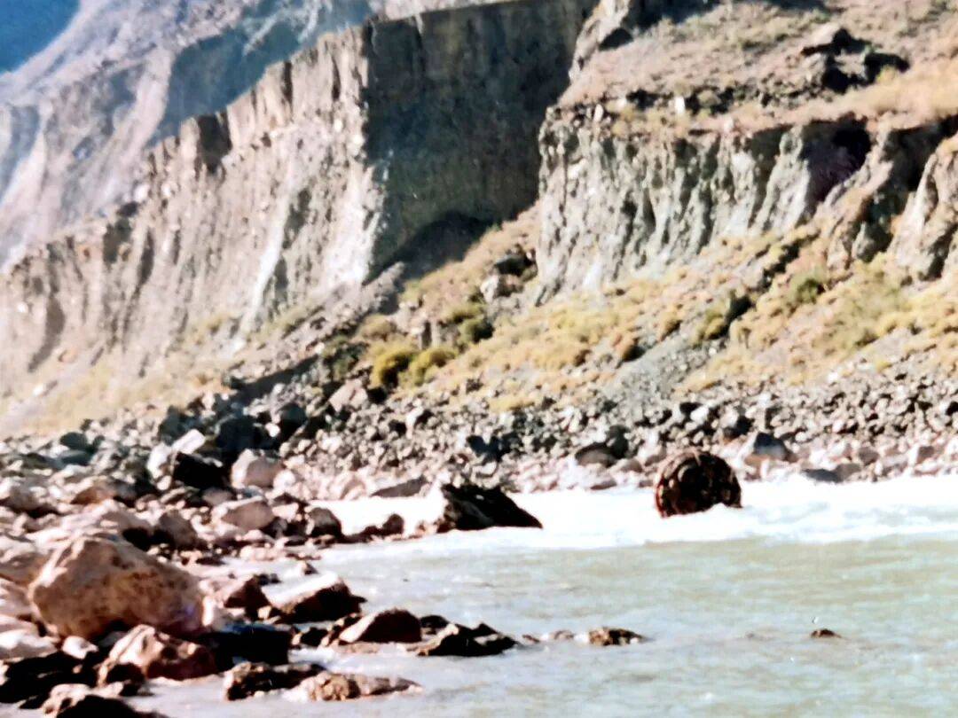 约10:30,密封船才晃晃悠悠地从上游沿着江边漂下来,速度很慢。船漂过我身边时,我拍了两张照。正当我想跑下去抢拍船过滩口的照片时,密封船竟然在我面前几米远的地方,搁浅在了一块礁石上,动弹不得。我大声叫船里的人用桨撑,可没有任何反应。我观察了一下,船搁浅的地方距我只有3米左右,水深大概齐膝,水流不算很急。我顾不得拍照,迅速脱掉鞋袜,把裤子卷至大腿。又脱去羽绒服,还把新买的一块西铁城手表取下来放到衣上。我蹚着冰凉刺骨的江水走到礁石旁,左手抱紧靠江边的另一块礁石,用右手奋力推船。我直推了几下,船纹丝不动。我又试着往斜上方推,终于缓缓动了,再推几下,船终于离开礁石,进入激流,飞速向滩口漂去。我三步两步跨上岸,连鞋都顾不上穿,赤足在鹅卵石上飞奔,追着拍照。船箭一般飞进滩口,在波涛中腾跃,3次被浪头打得侧立起来,像一个巨大的月饼被雪堆簇拥着疾速下漂。我一连追着拍了十几张,直到船拐弯不见。