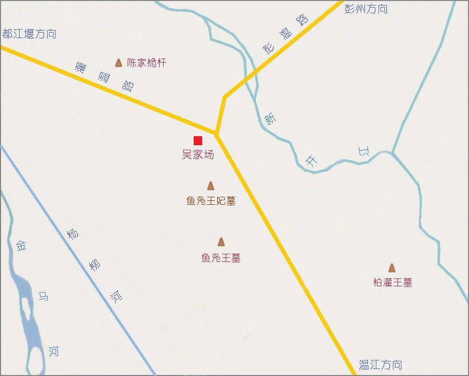 大墓山则为鱼凫王墓所在处。清宣统《温江县乡土志》载:“鱼凫王墓,在治西北三十四里,吴家场南二里,俗呼大墓山。”民国《温江县志》载:“吴家场,在治西三十五里,全集乡场,东南二里有鱼凫王墓,相传墓道寒烟在此。”鱼凫王墓,冢高五米,占地近五亩,现也仅一小圆丘。