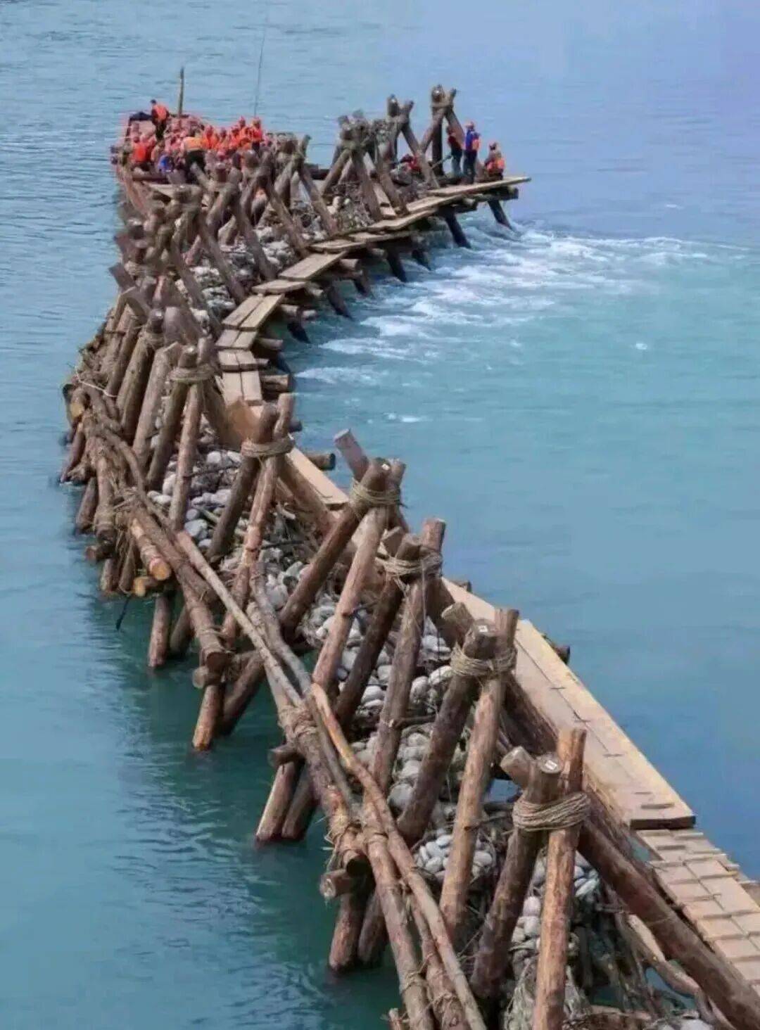 杩槎是用竹绳将三根木料捆扎成三角鼎足锥体形,再加上辅料所形成的水利工程设施。